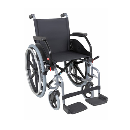 Cadeira de rodas manual de aço, perfeita para quem procura qualidade e estilo. Ideal para utilizadores com mobilidade reduzida, a sua estrutura robusta (com cruzeta tripla) e design atrativo facilitam o seu armazenamento.
