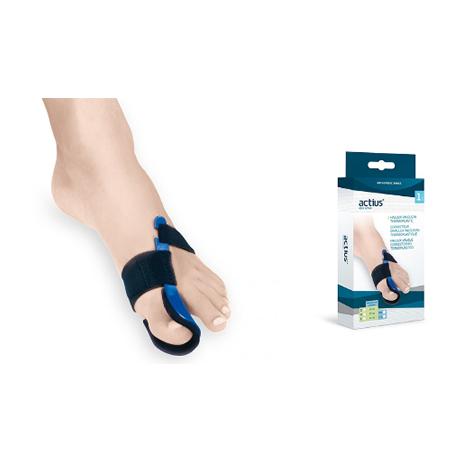 Corretor para joanetes fabricado em termoplástico e veludo. Inclui uma almofada de amortecimento no dedo do pé que juntamente com uma cinta de pressão em cima do joanete mantém o metatarso alinhado. Cor - Azul