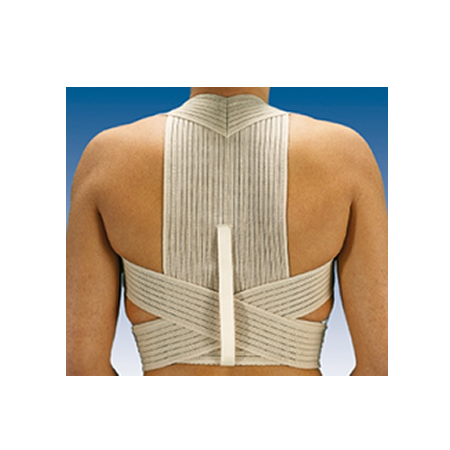 Tecido elástico transpirável multibanda, duas faixas que se prolongam sobre os ombros passando pela zona das axilas cruzando-se na zona traseira e fechando-se com fecho de velcro na zona abdominal, o que permite exercer uma tração gradual na zona dorsal obrigando a pessoa estar na posição corretã.