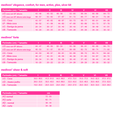 Cores: BeijeTamanhos: I, II, III, IV, V, VI, VII (conforme tabela)Classes de compressão: Ccl 1; Ccl 2; Ccl 3